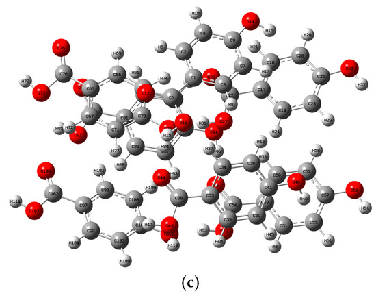 Index of atomic number corresponding to the optimized geometric structure for (a) 2-HA cluster of seven molecules, (b) 3-HA cluster of seven molecules, and (c) 4-HA cluster of seven molecules. Atomic elements in gray, white, and red represent carbon, hydrogen, and oxygen atoms, respectively.