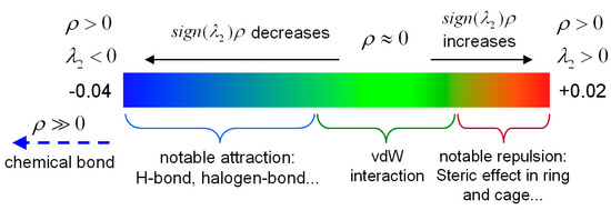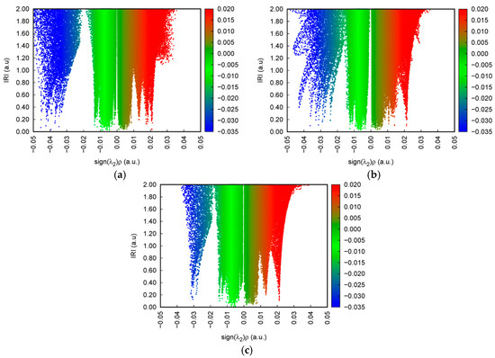 Furthermore, the sign(λ2)ρ function was defined in the IRI method, which was calculated using the actual electron density. Hence, when the sign(λ2)ρ function was mapped on the isosurfaces with a blue–green–red (BGR) color scale, a clear view of the interaction region and interaction type were obtained.