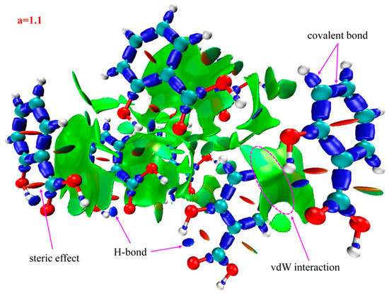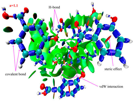 The IRI isosurface for the 4-HA cluster of seven molecules is shown in Figure 6. Belonging to H-bond interactions, one spike is found in the region between −0.05 and −0.02 in Figure 3c. The spike can be divided into one point according to the corresponding values of sign(λ2)ρ, located in −0.003 as seen in Table 2. In addition, two spikes are found in the region between −0.02 and 0, which belong to vdW interactions and are located in −0.014 and −0.006, and spikes belonging to steric effects are located in +0.006, +0.013, and +0.022.