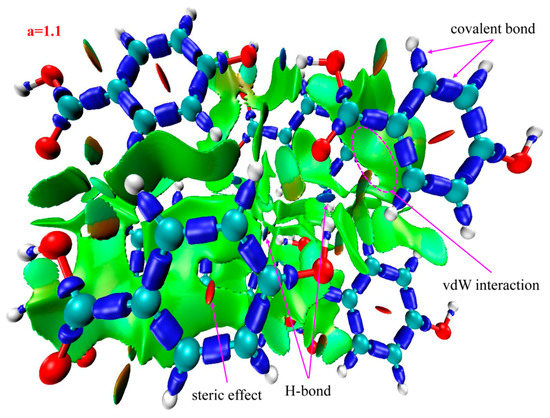 The IRI isosurface for the 3-HA cluster of seven molecules is shown in Figure 5. Belonging to H-bond interactions, multiple spikes are found in the region between −0.05 and −0.02 in Figure 3b. Associated with Table 2, these spikes can be divided into three points according to the corresponding values of sign(λ2)ρ, which are located in −0.043, −0.036, and −0.024. Moreover, two spikes are found in the region between −0.02 and 0, which, belonging to vdW interactions, are located in −0.012 and −0.006, and spikes belonging to steric effects are located in +0.004 and +0.021.