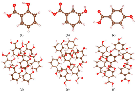 The molecular and cluster model of 2-, 3-, and 4-HA. Atomic elements in brown, peach, and red represent carbon, hydrogen, and oxygen atoms, respectively. These molecular structures are displayed using VESTA software. (a) Molecular of 2-HA; (b) molecular of 3-HA; (c) molecular of 4-HA; (d) cluster model of 2-HA; (e) cluster model of 3-HA; (f) cluster model of 4-HA.