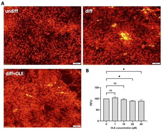 Effect of OLE treatment on cellular lipid accumulation in hASCs induced to adipocytic differentiation. Cells were cultured in an adipocytic differentiation medium for 7 days and then incubated with 20 μM of OLE for 14 days. Intracellular lipid levels were evaluated quantitatively and qualitatively using Nile red staining. (A) Representative fluorescence image. The scale bar indicates 200 μm. (B) Nile red fluorescence intensity quantification. Lipid content was quantified by relative fluorescence unit (RFU) of Nile red staining. Data were shown as mean ± SEM (n = 3/dose). ns, non-significant; * p < 0.05 statistical difference was calculated using one-way ANOVA followed by Tukey’s post hoc test.
