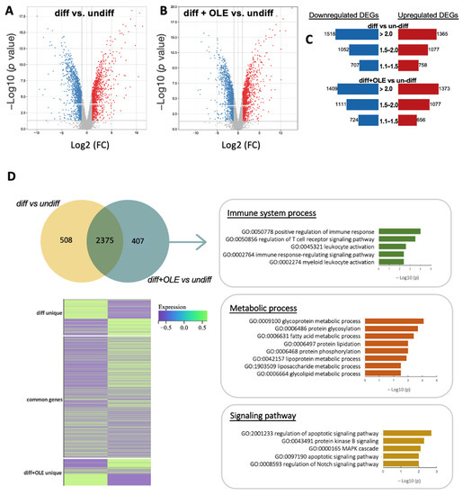 We performed whole-genome DNA microarray analysis to investigate the effects of OLE on gene expression profiling during hASC adipocytegenic differentiation. Genes with a 2-fold change (FC) and a significance level of p ≤ 0.05 were identified as differentially expressed genes (DEGs). The volcano plots display the FC values of all gene probe sets in the adipocyte-differentiated and undifferentiated group (diff vs. undiff), as well as the OLE-treated and adipocyte-differentiated and undifferentiated groups (diff + OLE vs. undiff) (Figure 2A,B). A total of 19,668 genes were identified in both comparison groups. In the hASCs adipocyte differentiation group, 2883 genes were differentially expressed compared to the undifferentiated group, of which 1365 DEGs were upregulated, and 1518 DEGs were downregulated. In the OLE-treated group, of 2782 DEGs, 1373 were upregulated, and 1409 were downregulated. Bar graphs show the distribution of FC values of up and downregulated DEGs (Figure 2C).