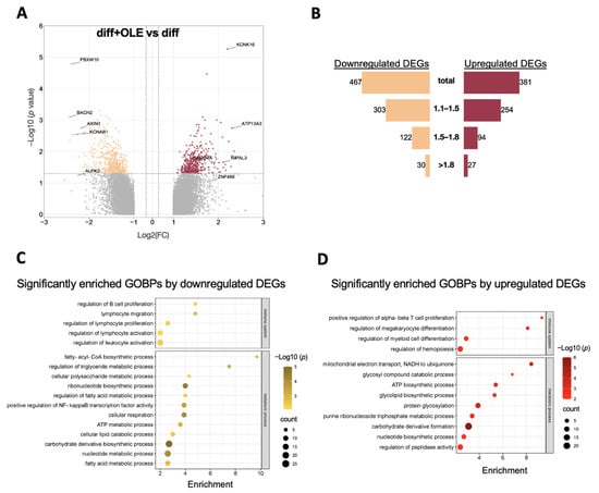 Microarray gene expression profile and GO analysis of OLE-treated adipocyte compared to nontreated adipocyte from hASCs. (A)The volcano plots exhibit the DEGs. The top 10 DEGs with the biggest fold changes are shown. The vertical axis (y-axis) corresponds to −log10 (p-value), and the horizontal axis (x-axis) displays log2 linear fold change. Up and downregulated DEGs are presented in the red and yellow dots. (B) The distribution of fold changes and the number of DEGs are shown in a bar graph. The blue bar represents DEGs that are downregulated, and the red bar represents DEGs that are upregulated. Dot plots are shown significantly enriched gene ontology biological process by downregulated DEGs (C) and upregulated DEGs (D). The x-axis displays the gene radio, and the y-axis represents the enrichment BPs, the size of bubbles pertains to the count/number of genes within the pathway, and the colors refer to the significance −log10 (p-value).