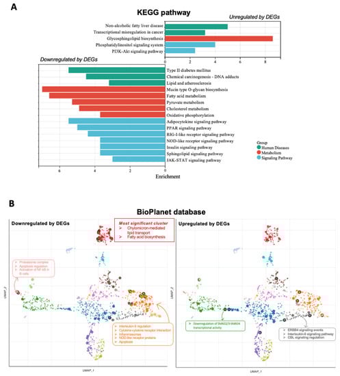 Next, we conducted pathway enrichment analysis to obtain a comprehensive and detailed pathway term list by using the Kyoto Encyclopedia of Genes and Genomes (KEGG) and BioPlanet_2019 database of diff + OLE vs. diff. The correlation among the enrichment score of various pathways in the KEGG database is shown in Figure 4A. It was observed that upregulated DEGs have a significant impact on nonalcoholic fatty liver disease and transcriptional misregulation in cancer pathways. The pathway of glycosphingolipid biosynthesis exhibited the highest enrichment score in the metabolism function. Furthermore, the upregulated DEGs showed enhancement of the phosphatidylinositol signaling system and P13K-Akt signaling pathway. The downregulated DEGs had a significant impact on various pathways, including T2D, which exhibited the highest enrichment score, followed by chemical carcinogenesis, lipid metabolism, and atherosclerosis in human diseases. In the metabolic function, the downregulated DEGs had a noticeable impact on pathways such as mucin-type O-glycan biosynthesis, fatty acid, pyruvate, cholesterol metabolism, and oxidative phosphorylation. Additionally, several signaling pathways, including adipocytokine signaling, PPAR signaling, insulin signaling, sphingolipid signaling, and the JAK-STAT signaling pathway, were regulated by the downregulated DEGs. The inhibition of certain pathways related to lipid metabolism by OLE indicates its potential beneficial effects in the treatment of type 2 diabetes (T2D).