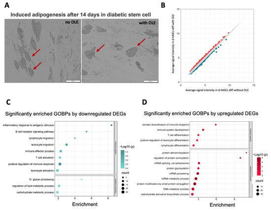 Microscopic images and gene expression analysis in adipocytes induced from d-hASCs after 14 days. (A) Representative light microscopic images of adipocyte after 14 days of induction with or without OLE. The arrows point to the lipid droplets in adipocytes. The scale bar indicates 100 µM. (B) Scatter plot showing the DEGs between OLE-treated and nontreated adipocytes from d-hASCs. The x-axis displays the average signal intensity of genes in adipocytes, and the y-axis corresponds to the average signal intensity of genes in OLE treated. Up and downregulated DEGs are presented in red and blue dots, respectively. Significantly enriched gene ontology biological process by downregulated DEGs (C) and upregulated DEGs (D). The gene ratio is shown on the x-axis, and the enrichment BPs are represented on the y-axis. The size of the bubbles corresponds to the number of genes in the pathway, and the colors indicate the significance of the −log10 (p-value).