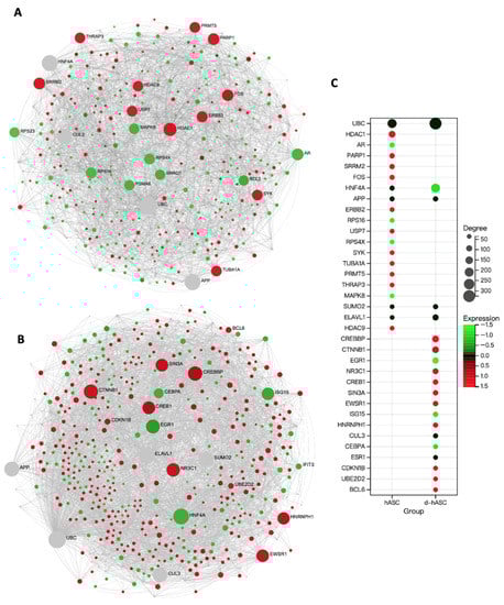 PPI Network analysis and molecular target prediction. Generic first-order PPI network of all DEGs in (A) hASCs and (B) d-hASCs. Conditions are shown in the ‘Force Atlas’ layout after the filtering. Each node represents the seeds and proteins, and edges between two connecting seeds indicate known interactions (IMEx Interactome database). Red nodes represent upregulated DEGs, and green nodes represent downregulated DEGs. Gray nodes are the proteins. (C) Top 20 seeds in the two adipocytes. The y-axis represents the name of each seed, the size of bubbles pertains to the degree value, and the colors refer to the expression value. The expression value for DEGs is the FC, and 0 for the predicted protein.