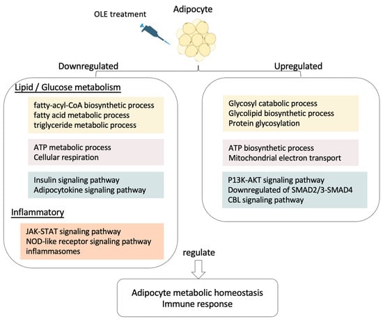 This phenomenon was also shown in the healthy adipocyte group. Not only was there a downregulation of T cells, B cells, lymphocytes, and leukocytes, but also the “NF-B transcription factor activity” term was downregulated in adipocytes differentiated from hASCs. Moreover, the DEGs regulated by NFκB1 and RELA were shown in two adipocytes that belong to the NF-κB family and play an important role in inflammation and metabolic disease [37]. Adipose tissue is known to be associated with chronic low-grade inflammation [38]. Previous research on human cells demonstrated that OLE amplifies anti-inflammatory activity in human macrophages via the expression of the CD163 receptor [39]. Additionally, in adipocytes with Simpson–Golabi–Behmel syndrome, OLE mitigated the expression of inflammation-related genes, resulting in decreased activation of NF-κB, which is consistent with our study [22,40]. OLE’s ability to rapidly activate signaling molecules through pharmacological principles may regulate the nutritional modulation of inflammatory diseases [41]. All these findings revealed that certain inflammation-related functions could be regulated in adipocytes by OLE.