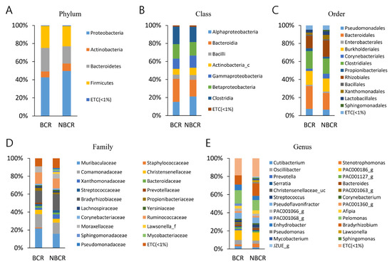 Averaged taxonomic composition for tumor regions in the BCR and NBCR group. Taxonomic relative abundance was classified at the (A) phylum, (B) class, (C) order, (D) family, and (E) genus level, and relative abundances of less than 1% were expressed as ETC. Wilcoxon rank-sum test was used to analyze the significance between the two groups. There were no significant differences.