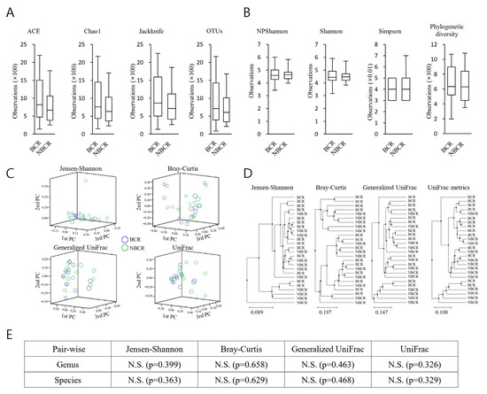 Alpha and beta diversity indices for BCR or NBCR. (A) Species richness was analyzed with Ace, Chao1, Jackknife, and OTUs. (B) The species diversity was examined using NPShannon, Shannon, Simpson, and Phylogenetic diversity. The boxplot edges denote the first and third quartiles, while the thick black band in the horizontal direction depicts the median value. The alpha diversity study results did not reveal any significant differences. (C) Distances between communities were analyzed by a principal coordinate analysis (PCoA). (D) The Unweighted Pair Group Method with Arithmetic Mean (UPGMA) was used to analyze clustering. (E) Beta set significance was demonstrated by Permutational multivariate analysis of variance (PERMANOVA). The Jensen–Shannon, Bray–Curtis, Generalized UniFrac, and UniFrac metrics were used to analyze beta diversity. N.S., not significant.