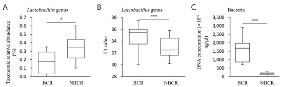 Taxonomic abundance for Lactobacillus with the largest LDA effect size between NBCR or BCR. (A) Taxonomic relative abundance showed Lactobacillus increased. (B) The quantitative distribution of Lactobacillus was also confirmed through quantitative real-time PCR analysis. The Ct value in the NBCR group sample was lower than that of the BCR group, thereby confirming that Lactobacillus was contained more in the NBCR than in the BCR. (C) PCR also quantified the number of total bacteria, and it was confirmed that the BCR contained significantly higher levels than the NBCR group. Statistical significance with controls was analyzed using Wilcoxon rank-sum test and unpaired Student’s t-test. * p < 0.05, *** p < 0.001.