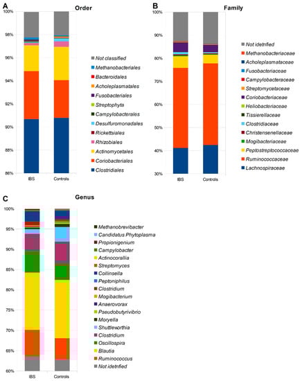 The relative abundance of microbiota in stool samples obtained from patients with IBS and non-IBS control group regarding the order (A), family (B), and genus taxonomy (C) levels.