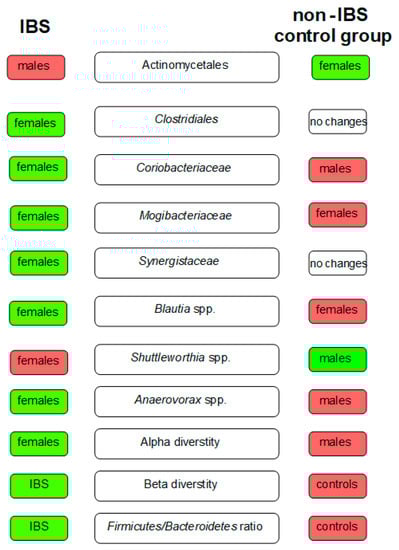 The key differences in gut microbiota between patients with IBS and the non-IBS control group. The green boxes indicate the microbiota of higher abundance among females/males in the study groups and the red ones of lower abundance.