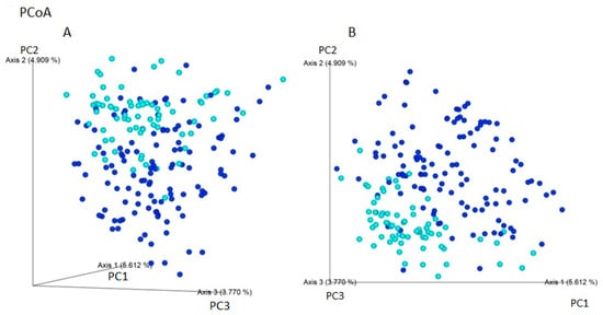 To determine which participants of the study had more diverse gut microbiota, four tests were performed: Bray–Curtis, Jaccard dissimilarity, and weight and unweight UniFrac using the QIIME 2 program, and the results were shown as the Principal Coordinates Analysis (PCoA).
