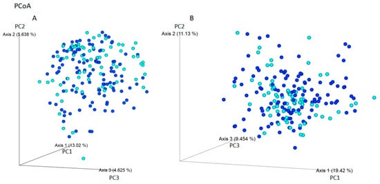 Beta-diversity assessed by the (A) unweight-UniFrac and (B) weight-UniFrac tests between IBS individuals (navy blue) and non-IBS individuals - CI (light blue) based on ASVs (PCoA analysis). The phylogenetic origin of the intestinal microbiota, taking into account the amount of ASVs, is similar among the studied groups. The percentage of the total variance for each axis is shown in parentheses.