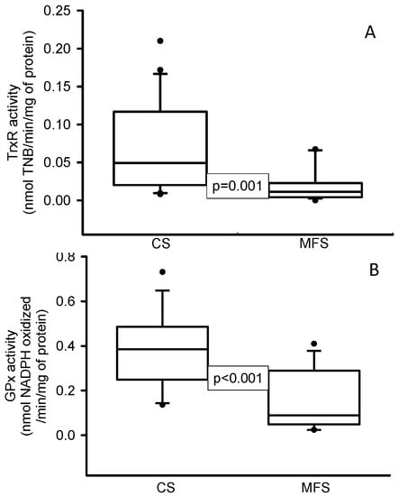 Enzymatic activities of TrxR (A) and GPx (B) in TAA from MFS patients in comparison with a segment of the thoracic aorta from CS. Values are expressed as the median and Min–Max range. Abbreviation: CS = control subjects, GPx = glutathione peroxidase, TrxR = thioredoxin reductase, MFS = Marfan syndrome.