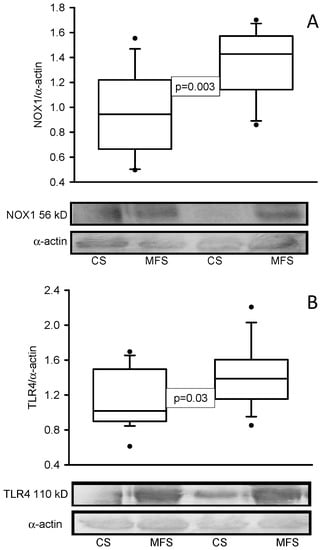 Protein expression of NOX1 (A) and TLR4 (B) in TAA from MFS patients in comparison with a segment of the thoracic aorta from CS. The Western blots are representative examples. Values are expressed as the median and Min–Max range. Abbreviation: MFS = Marfan syndrome, CS = control subjects.