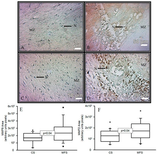 Representative microphotograph at 32× with immunostaining for an antibody against MMP9 (A,B) and immunostaining for an antibody against MMP2 (C,D) in the muscular zone in segments of thoracic aorta from CS and TAA from MFS patients, respectively. The graphics (E,F) represent the densitomorphometry of the analyzed area with immunostaining for antibodies against MMP9 and MMP2, respectively. The values are expressed in arbitrary units (pixels). The data are presented as median and Min–Max range. Abbreviations: C = cystic necrosis, CS = control subject, MSF = Marfan syndrome, MZ = muscular zone, N = cell nucleus.