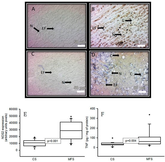 Representative microphotograph at 32× with immunostaining for an antibody against NOS2 (A,B) and an antibody against TNF (C,D) in the muscular zone in a segment of the thoracic aorta from CS vs. a segment from the TAA from MFS patients, respectively. The graphics (E,F) represent the densitomorphometry of the analyzed area with the immunostaining for antibodies against NOS2 and TNF, respectively. The values are expressed in arbitrary units (pixels). The data are presented as median and Min–Max range. Abbreviations: C = cystic necrosis, CS = control subject, EF = elastic fibers, MSF = Marfan syndrome, N = cell nucleus.