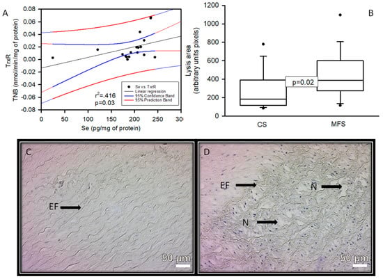 Linear regression of Se concentration vs. TrxR activity (A) in the TAA homogenate of the MFS patients, constant variance test Spearman rank correlation. Densitomorphometry of the area of lysis (cystic necrosis) in the zone media muscular (B) And representative microphotograph at 32× (C,D) in the TAA of the MFS patients vs. a segment of the thoracic aorta from CS, respectively. Cystic necrosis with rupture of elastic fibers is observed in MFS patients. Abbreviations: EF = elastic fibers, N = cystic necrosis.