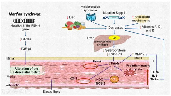 Se concentrations are decreased in the TAA of MFS patients. This can contribute to a decrease in TrxR and GPx activities and thiol groups. A decrease in the activities of these enzymes may contribute to the loss of redox homeostasis, which can, in turn, contribute to an increase in the pro-inflammatory interleukins associated with MMP9 and MMP2 overexpression.