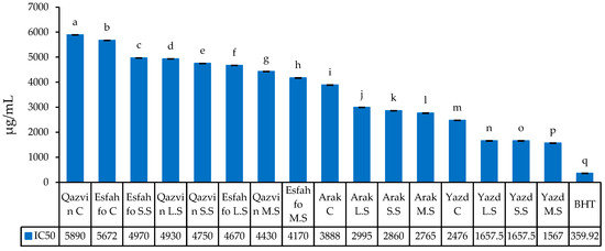 Comparisons were performed to detect variations in the scavenging of DPPH free radicals in the ajowan extracts (Figure 3). The IC50 values were found to vary from 1566.985 µg/mL to 5889.99 µg/mL. More specifically, the extract of the Yazd population subjected to MS and SS showed the strongest antioxidant activities (1566.985 and 1657.46 µg/mL, respectively), while those from Qazvin (C) and Esfahfo (C) demonstrated the weakest activities (5889.99 and 5671.98 µg/mL, respectively). The variation in IC50 observed among different species might be interpreted with recourse to the diversity in their polyphenolic components [40]. It likely can be suggested that plants activate metabolite biosynthesis as part of a complex antioxidant defense mechanism when they are exposed to salt stress and that the production of phenolic compounds might be part of an alternative strategy adopted by plants to respond to stressful conditions. The antioxidant capacity of Thymus species has been well researched. The most relevant chemotypes of Thymus species have been reported to be rich in phenolic monoterpenes, such as thymol and carvacrol [41]. In most such studies, phenolics, due to their chemical structures, which allow them to donate hydrogen to free radicals, were introduced as the main factor contributing to the antioxidant activity of the species [42]. Moreover, [43] reported that, based on the observations, the highest antioxidant capacity recorded might be due to large amounts of phenolic components of the species. Studying the effect of salt stress on the antioxidant activity of Apiaceae plants, [21] reported a large variation in the antioxidant activity of some Indian Apiaceae spices based on their results from DPPH assay. Similarly, [44] used the DPPH method to observe a large variation in the antioxidant capacity of three Ferula species.
