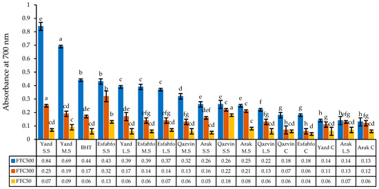 The reducing power of the studied ajowan populations was found to rise with increasing EO concentrations (Figure 4). Clearly, the greatest absorbance antioxidant capacity at 700 nm was obtained from Yazd (SS) (0.84) in 500 mg/L, while Arak (C) exhibited lower activity than BHT (butylated hydroxytoluene). From among the ajowan populations, in absorbance at 700 nm, Yazd (SS), Yazd (MS), Esfahfo (SS), and Yazd (LS), recorded reducing powers of 0.84, 0.69, 0.44, 0.39, and 0.39, respectively, which were higher than those recorded for the other populations (Figure 4). Similarly, [45] reported that the strongest reducing power was observed in A. pachycephala at concentrations of 300 and 500 mg/L. In a similar study based on the reducing power model, [8] found that myrtle subjected to salt stress showed an increased antioxidant activity with increasing extract concentrations.