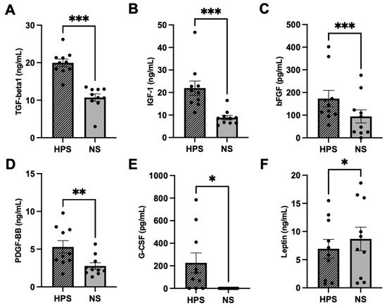 Quantitative analysis of chondrogenic growth factors in HPS and NS. (A) TGF-beta1, (B) IGF-1, (C) bFGF, (D) PDGF-BB, (E) G-CSF and (F) Leptin. The blood samples for each HPS and NS are from the same donor; blood donors: n = 10, paired t-test. Data points are means ± SEM. * p < 0.05, ** p < 0.01, *** p < 0.001.