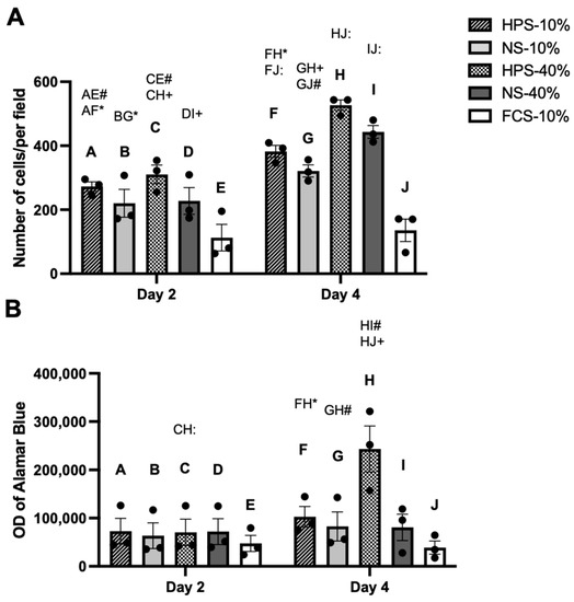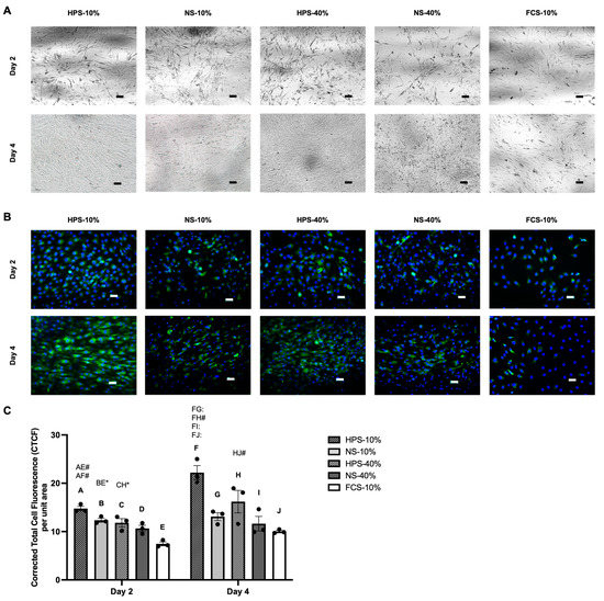 Cell metabolic activity assessed with Alamar Blue assay showed the highest optical density (OD) values with HPS-40% stimulation on day 4 (Figure 2B). This was significantly higher than the conditions with 2 days of HPS-40% (p < 0.0001) and 4 days of HPS-10%, NS-10%, NS-40% stimulation and FCS-10% controls (p = 0.01, p = 0.004 and p < 0.001, respectively).