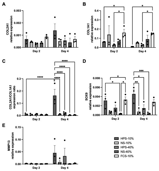 Gene expression of chondrogenic markers in human chondrocytes treated with HPS-10/40% compared to NS-10/40% (pooled from ten blood donors) and FCS-10% (control) after 2 and 4 days of stimulation. (A) Collagen type II (COL2A1), (B) collagen type I (COL1A1), (C) differentiation index (COL2A1/COL1A1), (D) SOX9 and (E) MMP13. Relative expression was normalized to GAPDH (dCT-method). Two-way repeated-measures ANOVA with Tukey’s multiple comparisons test. Data points are means ± SEM, chondrocyte donors: n = 3. For each chondrocyte donor, the mean of trials in triplicate was calculated. * p < 0.05, ** p < 0.01, *** p < 0.001, **** p < 0.0001.