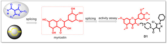 Therefore, we introduced the pyrazole amide structure and the piperazine ring into the skeleton of myricetin to synthesize 19 derivatives, aiming to improve the biological activity of myricetin derivatives. The design strategy of the target compound is shown in Figure 4. In addition, their biological activities were evaluated, and the preliminary mechanism of compounds exhibiting excellent biological activity was explored.