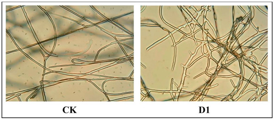 After D1 (12.5 μg/mL) treatment, Phomopsis sp. hyphae were observed under a microscope (100 × 1.25), as depictedas in Figure 6. Specifically, compared to the blank control group (0.5% DMSO), the growth of Phomopsis sp. Mycelia were inhibited upon being treated with D1. Additionally, increased branching, production of short hyphae and uneven thickness distribution were observed.