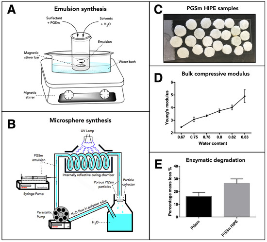 Schematic drawing of the experimental setup to produce (A) the high internal phase emulsions and (B) the microspheres. (C) PGSm polyHIPE samples to be used for mechanical testing and enzymatic degradation studies. Results from the mechanical testing (D) and enzymatic degradation studies (E) are shown (standard deviation error bars, n = 3).