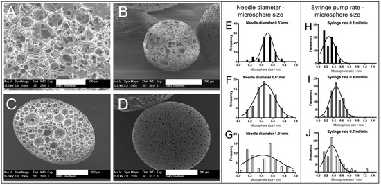 SEM images of the crosslinked emulsion and microspheres. (A) The bulk emulsion when fully crosslinked and dried, scale bar 100 µm. (B,D) Synthesised microspheres, scale bar 100 µm and 200 µm, respectively. (C) A cross-section of a microsphere showing a highly porous interior, scale bar 200 µm. Histograms showing the effects of two experimental variables on the produced microsphere size. Histograms in (E–G) demonstrate the effect of changing the syringe needle diameter (0.33 mm, 0.61 mm, 1.91 mm) on the microsphere size. (H–J) The effect of changing the syringe pump rate (0.1 mL/min, 0.4 mL/min, 0.7 mL/min, needle diameter 0.61) on the microsphere size. All histograms were produced using SEM image analysis, whereby 75 individual microsphere diameters were measured using Image J (version 1.53t, NIH). All histograms were fitted with a Gaussian distribution curve.