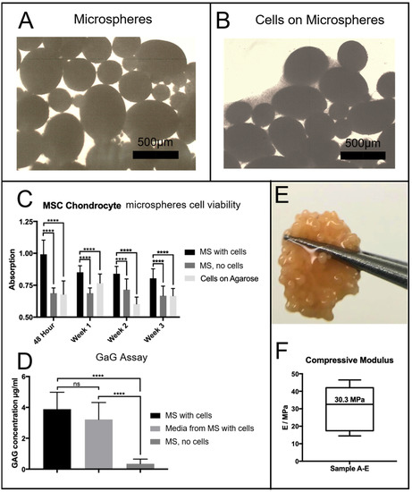 Light microscope images of (A) PGSm microspheres without cells and (B) PGSm microspheres with cells (scale bar 500 µm) 24 h after seeding. (C) Resazurin metabolic assay of the microspheres (MS) seeded with cells, compared to the signal of a negative control (cell-free microspheres (MS)) and the cells seeded onto agarose. This study was performed at 48 h, and on days 7, 14 and 21. A two-way ANOVA with Tukey’s post hoc test showed a statistically significant difference between the seeded microspheres and other variables at each time point (****, p ≤ 0.0001, n = 3). (D) A DMB assay for GaGs was performed after three weeks. This was performed on microspheres (MS) seeded with cells, medium from microspheres (MS) and cell-free microspheres (MS). A one-way ANOVA with Tukey’s post hoc test showed a statistically significant difference between both microspheres with cells and medium from the microspheres with cells when compared with microspheres without cells (****, p ≤ 0.0001). There was no statistically significant difference (ns) between the microspheres with cells and media from the microspheres with cells. (E) A photograph of the microspheres following 3 weeks of culture: extracellular matrix/collagen had grown across and through the microspheres, creating a strong disk, as seen held between tweezers (approximate disk diameter 5 mm). (F) Compressive modulus of the microspheres/microsphere disk after 3 weeks in culture, with a mean compressive modulus of 30.3 MPa (n = 5).