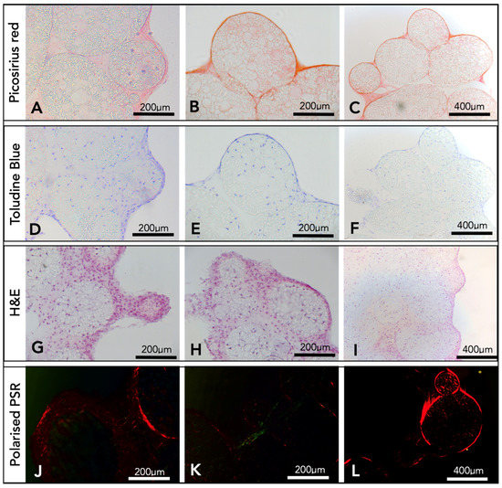 Histological results from microspheres seeded with chondrocytes after three weeks. The first two columns have 200 µm scale bars and the end column has a 400 µm scale bar. The first row (A–C) shows results from a Picro sirius red stain. The second row (D–F) shows results of the toluidine blue stain, with the stain showing as deep blue and purple. The third row (G–I) shows results from an H&E stain, and these three rows were imaged using an upright light microscope. The final row (J–L) represents the Picro sirius red stain, imaged using an Olympus BX61 upright microscope, setup using a rotatable polariser under the condenser.