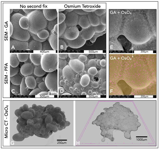 (A–D) SEM images of microsphere tissue disks prepared with different techniques. (G,H) Micro-CT models of the microsphere tissue disk. Images (A,B) were fixed in glutaraldehyde and (C,D) were fixed in paraformaldehyde. Images (A,C) had no secondary fix, whereas images (B,D) had a secondary fix in 2% aqueous osmium tetroxide for two hours. (E) A higher-magnification SEM image of the microsphere disk with a glutaraldehyde and osmium fix (same as (D)). (F) A false colour representation of (E). (G,H) Micro-CT representations of the microsphere tissue disks fixed in glutaraldehyde and osmium tetroxide. (G) A three-dimensional representation of the disk. (H) A slice within this polymer disk.