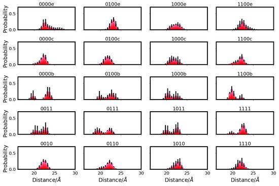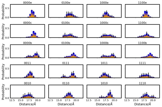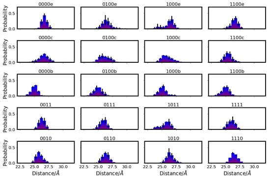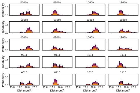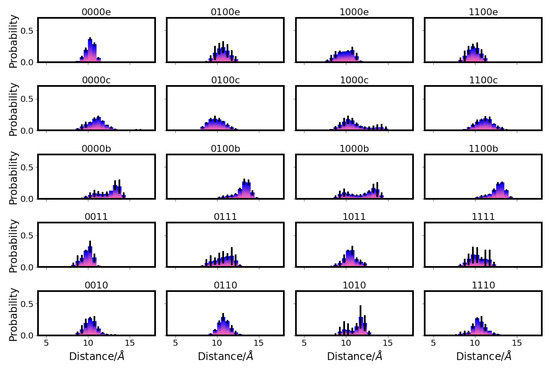 Distribution of distances between N121 and N139 in different protonation models of CcO. For the other models, see Figure S1. The different models are labelled according to the protonation states of residues D132, E286, K362, and E101, where “0” means unprotonated and “1” means protonated. Letters a–f refer to a ion in the K-channel at different heights (see also Table 5 in “Materials and Methods”).