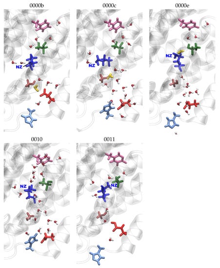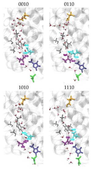 Snapshots of the D-channel for models with varying D-channel protonation. The different models are labelled according to the protonation states of residues D132, E286, K362, and E101, where “0” means unprotonated and “1” means protonated (see Table 5 in “Materials and Methods”). Important residues are shown in colour (dark blue: H26; cyan: N121; lime: D132; purple: N139; orange: E286).