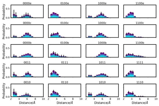 Distribution of distances between E286 and N139 in different protonation models of CcO. For the other models, see Figure S2. The different models are labelled according to the protonation states of residues D132, E286, K362, and E101, where “0” means unprotonated and “1” means protonated. Letters a–f refer to a ion in the K-channel at different heights (see Table 5 in “Materials and Methods”).