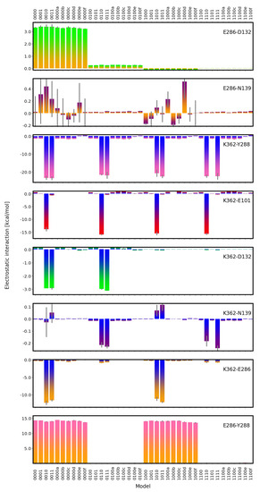 ion. Similarly, K362 interacts most favourably with E101 when both residues sre (oppositely) charged (models *10 and *01; see Figure 10).