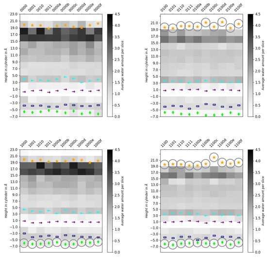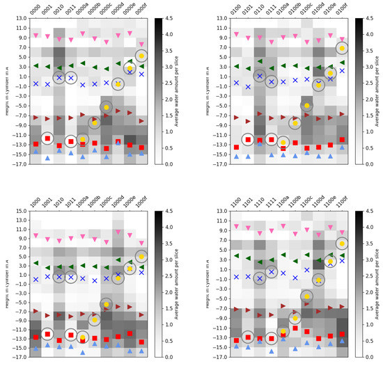 Average number of water molecules in the D-channel polyhedron (The volume of the polyhedraon is reported in Table S8). The different models are labelled according to the protonation states of residues D132, E286, K362, and E101, where “0” means unprotonated and “1” means protonated (see Table 5 in “Materials and Methods”). Letters a–f refer to a ion in the K-channel at different heights (see also Figure 20d in “Materials and Methods”).