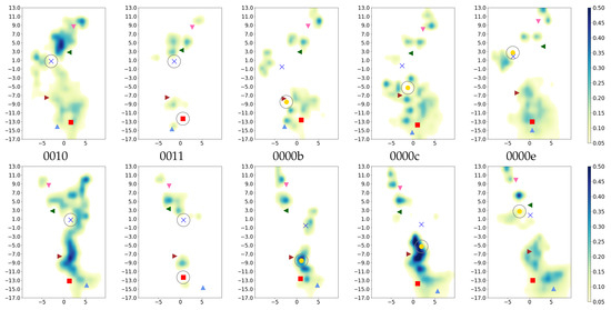 Projection of water occupancy in the K-channel of CcO with the most important K-channel protonation states (for the projections of all models, see Supplementary Figure S43). The different models are labelled according to the protonation states of residues D132, E286, K362, and E101, where “0” means unprotonated and “1” means protonated (see Table 5 in “Materials and Methods”). Letters a–f refer to a ion in the K-channel at different heights (see also Figure 20d in “Materials and Methods”). The D-channel is unprotonated in the models shown (model 00*). The lower row shows a view 90 degrees rotated from that in the upper row. For the other models, see Figure S43 in the Supplementary Material. The symbols mark the average height of protein residues H96 (light blue triangle