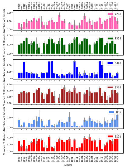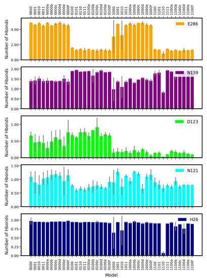 Average number of hydrogen bonds between protein residues and water in the K-channel of CcO (see also Table S11). The different models are labelled according to the protonation states of residues D132, E286, K362, and E101, where “0” means unprotonated and “1” means protonated (see Table 5 in “Materials and Methods”). Letters a–f refer to a ion in the K-channel at different heights (see also Figure 20d in “Materials and Methods”).