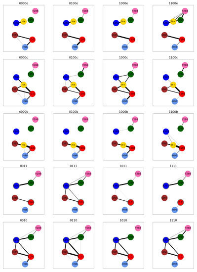 Hydrogen-bond connections between important protein residues (represented by coloured nodes: Y288: pink; T359: dark green; K362: blue; S365: brown; H96: light blue; E101: red) in the K-channel of CcO. Residues with an excess proton are marked by a grey circle around the symbols representing the respective residues. The thickness of the lines indicates the probability of finding a hydrogen-bond connection. Only connections with at least 1% occurrence are shown for clarity. For hydrogen-bonded networks of the other models, see Supplementary Figure S47. The different models are labelled according to the protonation states of residues D132, E286, K362, and E101, where “0” means unprotonated and “1” means protonated (see Table 5 in “Materials and Methods”). Letters a–f refer to a ion in the K-channel at different heights (see also Figure 20d in “Materials and Methods”).