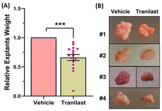 (A) Fresh fibroids explants were implanted subcutaneously in the ovariectomized CB-17 SCID/Beige mice, and the vehicle or tranilast (50 mg/kg/daily) was administered i.p. daily for 8 weeks. The weight of tumor explants was determined after 8 weeks of treatment (n = 16). (B) Representative images of four xenografts at the end of treatment period (8 weeks). The results are presented as mean ± SEM of independent experiments, with p values indicated at the corresponding line. *** p < 0.001.