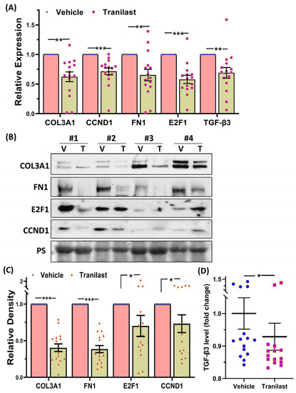 The total protein isolated from xenografts of the vehicle and tranilast groups was subjected to immunoblotting as previously described [38,39]. Briefly, samples were suspended in a RIPA buffer containing 1 mM EDTA and EGTA (Boston BioProducts, Milford, MA, USA) supplemented with 1 mM PMSF and a complete protease inhibitor mixture (Roche Diagnostics, Indianapolis, IN, USA), sonicated, and centrifuged at 4 °C for 10 min at 14,000 rpm. The concentration of protein was determined using the BCA™ Protein Assay Kit (Thermo Scientific Pierce, Waltham, MA, USA). Equal aliquots (30 micrograms) of total protein for each sample were denatured with SDS-PAGE sample buffer and separated by electrophoresis on an SDS polyacrylamide gel. After transferring the samples to a nitrocellulose membrane, the membrane was blocked with TBS-Tween + 5% milk and probed with the following primary antibodies: COL3A1 and FN1 (Proteintech Group, Inc., Chicago, IL, USA), CCND1 (Cell Signaling Technology, Danvers, MA, USA), and E2F1 (Santa Cruz Biotechnology, Dallas, TX, USA). The membranes were washed with TBS containing 0.1% Tween-20 wash buffer after each antibody incubation cycle. SuperSignal West Pico Chemiluminescent Substrate™ (Thermo Scientific Pierce, Waltham, MA, USA) was used for detection, and photographic emulsion was used to identify the protein bands, which were subsequently quantified by densitometry. The densities of the specific protein bands were determined using the image J program (http://imagej.nih.gov/ij/ (accessed on 10 June 2023)), normalized to a band obtained from staining the membrane with Ponceau S. Results were expressed as means ± SEM as a ratio relative to the control group, designated as 1.