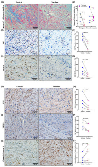 (A,B) Representative histopathological images determined by Masson’s trichrome staining of fibroid xenografts from vehicle or tranilast-treated group (magnification, ×20). Blue color demonstrates collagen fibers, and red color indicates smooth muscle cells. (B) Shows the quantification of staining intensity by Halo software (Indica Labs-Area Quantification v2.4.2) (n = 5 in each group). (C–L) Representative immunohistochemically stained images of fibroid xenografts treated with vehicle or tranilast (magnification, ×20) for Ki67 (C,D), CCND1 (E,F), E2F1 (G,H), and TGF-β3 (I,J) and cleaved caspase 3 (K,L). Quantification analysis by Halo software (Indica Labs-Multiplex IHC v3.2.3) for the positive staining in nucleus (D,F,H,L) and cytosol (J) (n = 5 in each group). The results are presented as mean ± SEM, with p values indicated at the corresponding line. * p < 0.05; ** p < 0.01.