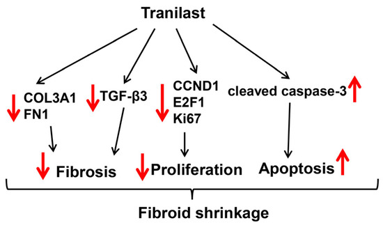 Schematic diagram representing the potential inhibitory mechanism of tranilast on fibroid growth and progression. Fibroids are characterized by increased expression levels of COL3A1, FN1, and TGF-β3 (ECM deposition and tissue fibrosis) [10,38] and CCND1 and E2F1 (mediated cell proliferation) [10,39]. Tranilast treatment significantly inhibits the expression of these genes while inducing apoptosis through increased levels of cleaved caspase 3, resulting in repressed ECM deposition, proliferation, and decreased fibroid size.