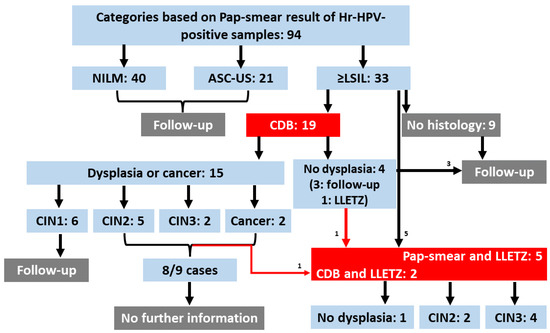 Flowchart. Summary of patient information. Ninety-four Hr-HPV-positive samples were collected. Five of them were directly recruited for LLETZ without CDB. Nineteen were recruited to colposcopy. Four colposcopy patients were diagnosed as not-dysplastic; three were released with a 6-month follow-up condition, and the other had suspicious sample material and was sent for LLETZ. Six patients of the colposcopy cohort were diagnosed with CIN1 and were released with a 6-month follow-up condition. Eight cases of nine patients diagnosed with CIN2+ could not be tracked further during the writing process. (CDB = colposcopy-directed biopsy; LLETZ = large loop excision of the transformation zone; NILM: negative for intraepithelial lesion or malignancy; ASC-US: atypical squamous cells of undetermined significance; ≥LSIL: low-grade squamous intraepithelial lesion or worse).